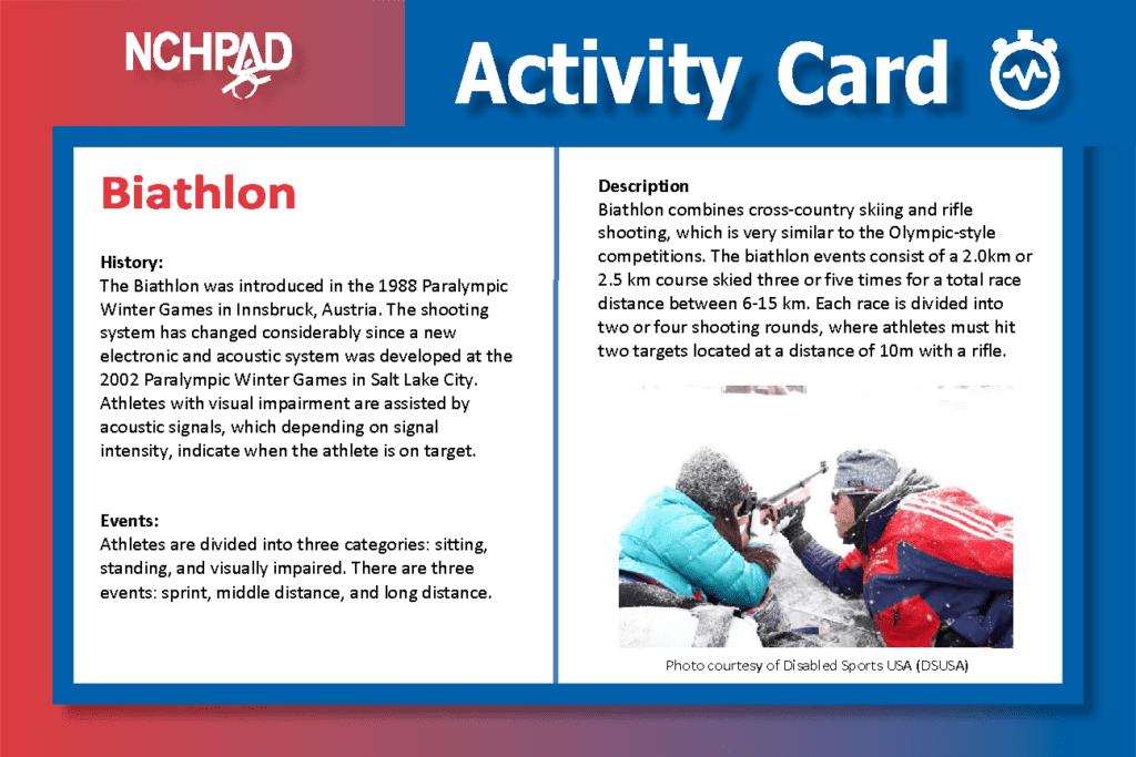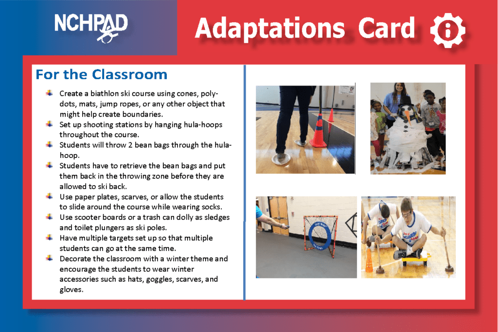 Are you looking for ways to adapt popular sports for the classroom? Take a look at NCHPAD’s activity/adaptation cards. These cards offer information, tips, and pictures on how to adapt sports, activities, games, and equipment. On the front of the card, you can find a brief introduction, description, and history of the sport. On the back of the card, you can find information and pictures on how to adapt each sport.